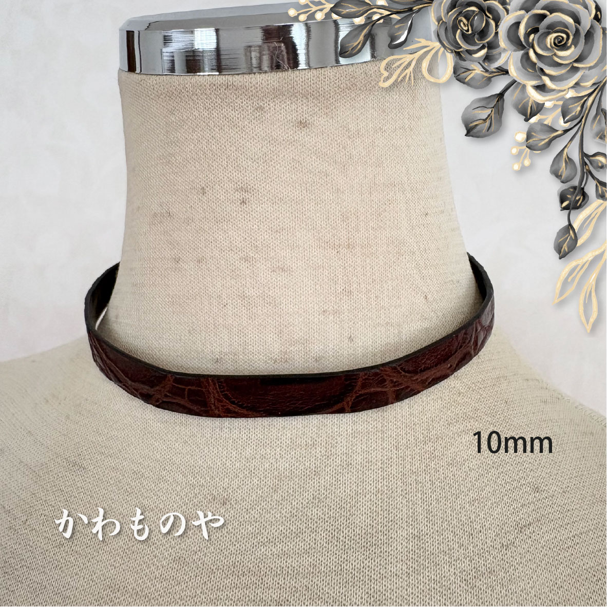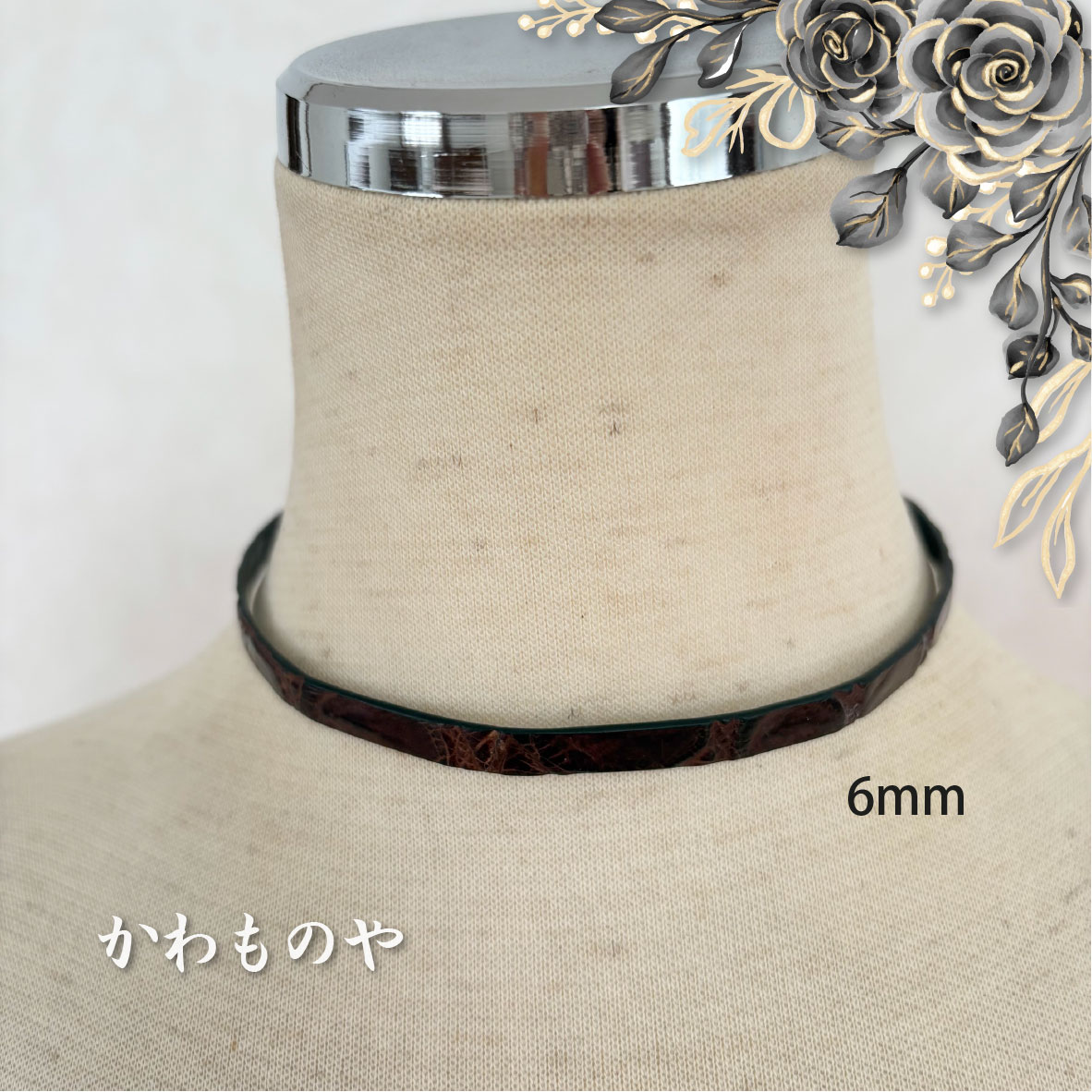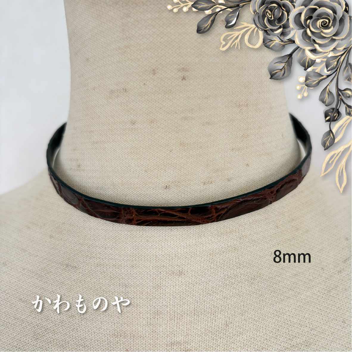 本革 クロコダイル(鰐革)レザーチョーカー 茶色 ネックレス サージカルステンレス使用(太さ3種類)6mm 8mm 10